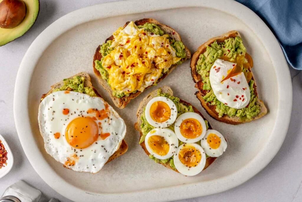 - Scrambled Egg Avocado Toast: Fluffy, soft eggs with creamy avocado.